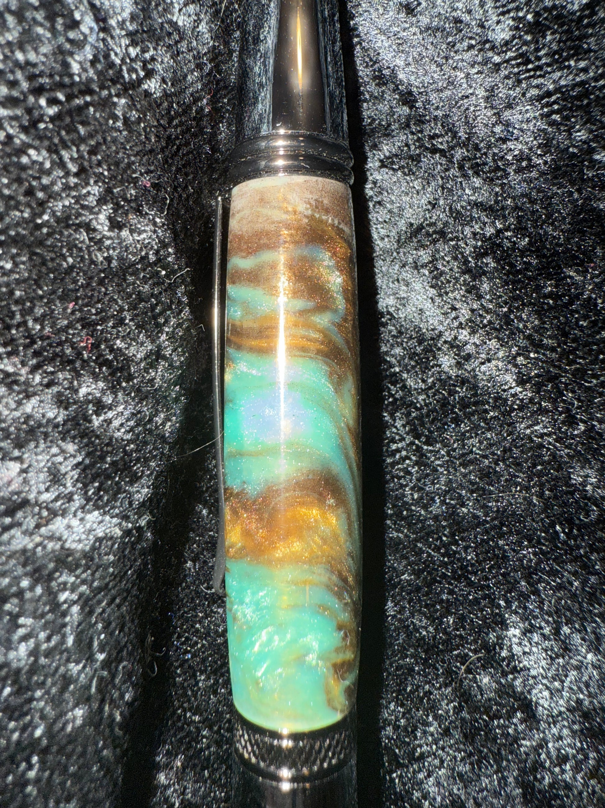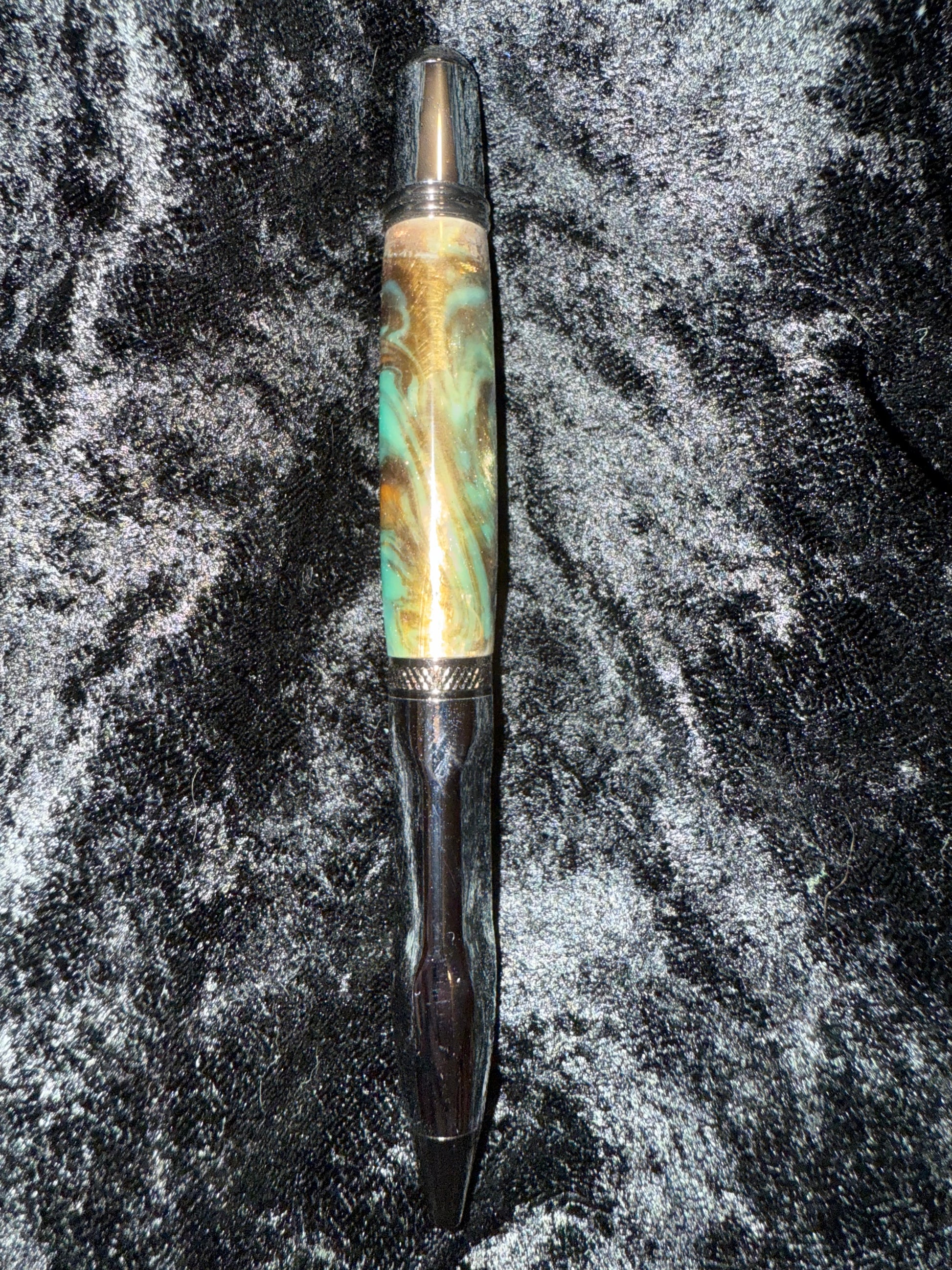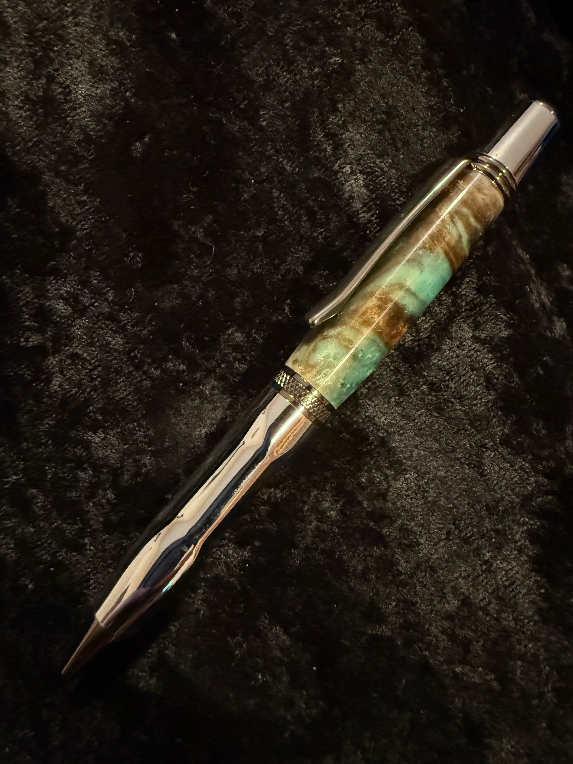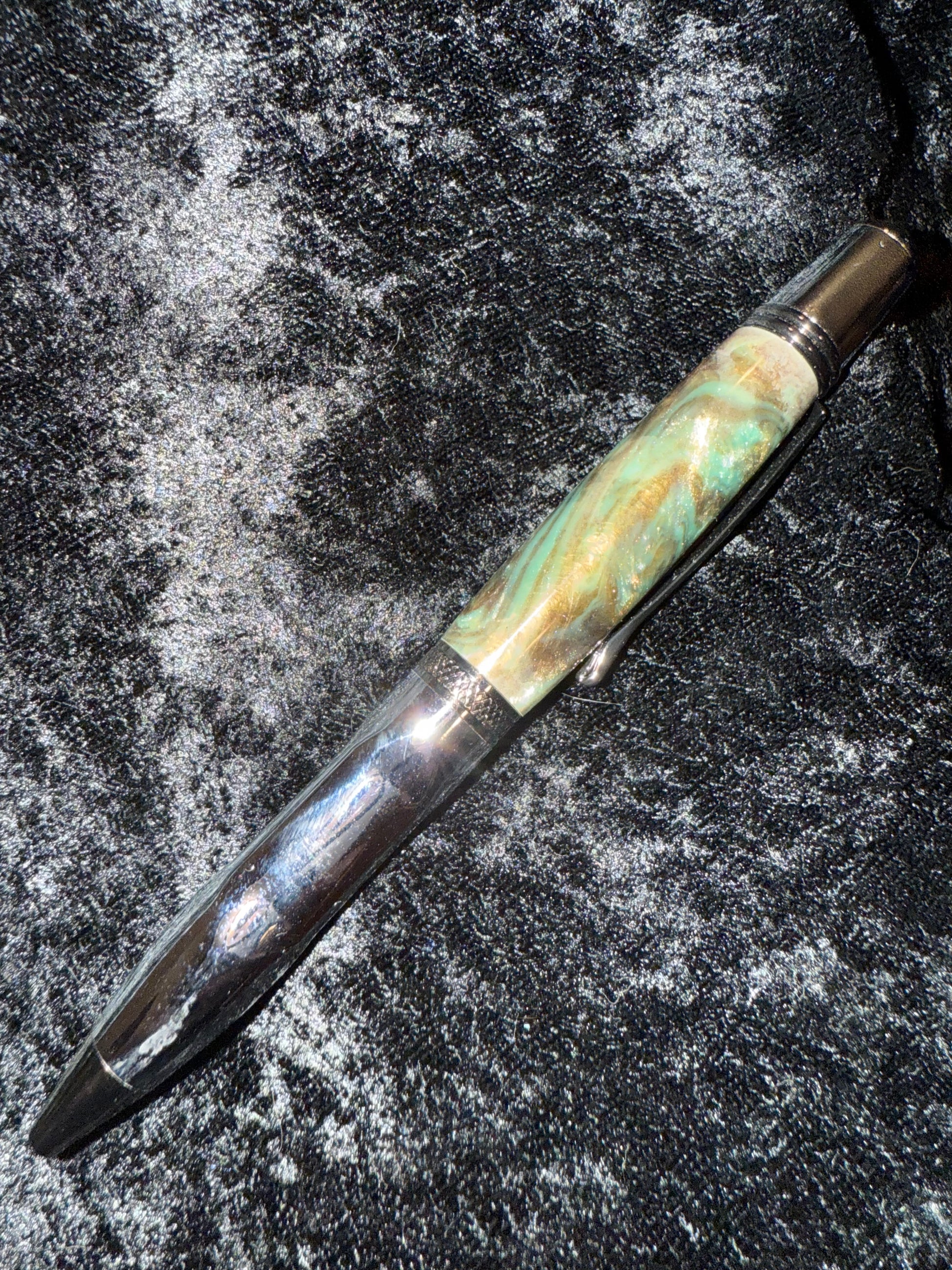 Indulge in the luxurious experience of our hand- Lathed pen. The vibrant swirl of chocolate and mint, combined with the sleek chrome design, makes writing a delight for the senses. Hand lathed for perfection, this pen is not only stunning but also economically designed for complete refillability. Treat yourself to this exquisite writing instrument!