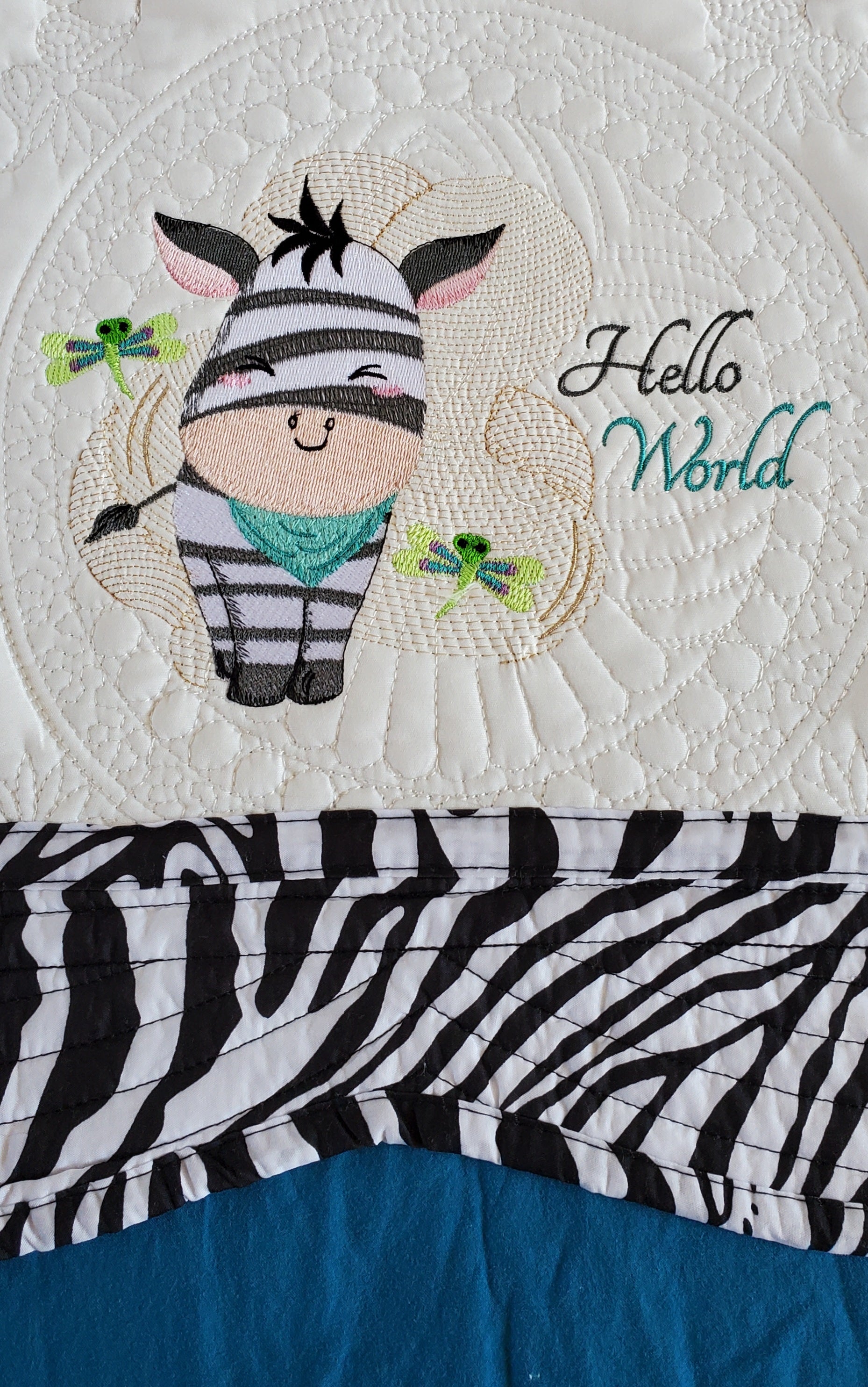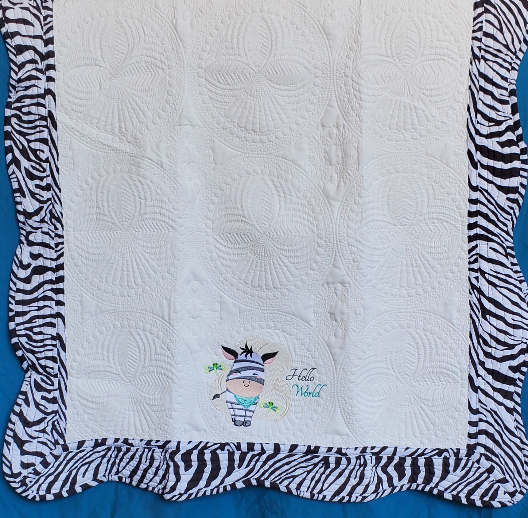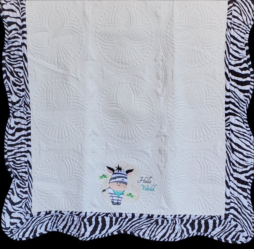 Transform your child's room with our Embroidered Zebra Heirloom Quilt! Adorned with a darling zebra, this quilt adds a touch of playful charm. The beautiful zebra print border and generous size of 36" x 46" make it a statement piece on any bed. Create a cozy and stylish space with our unique quilt.